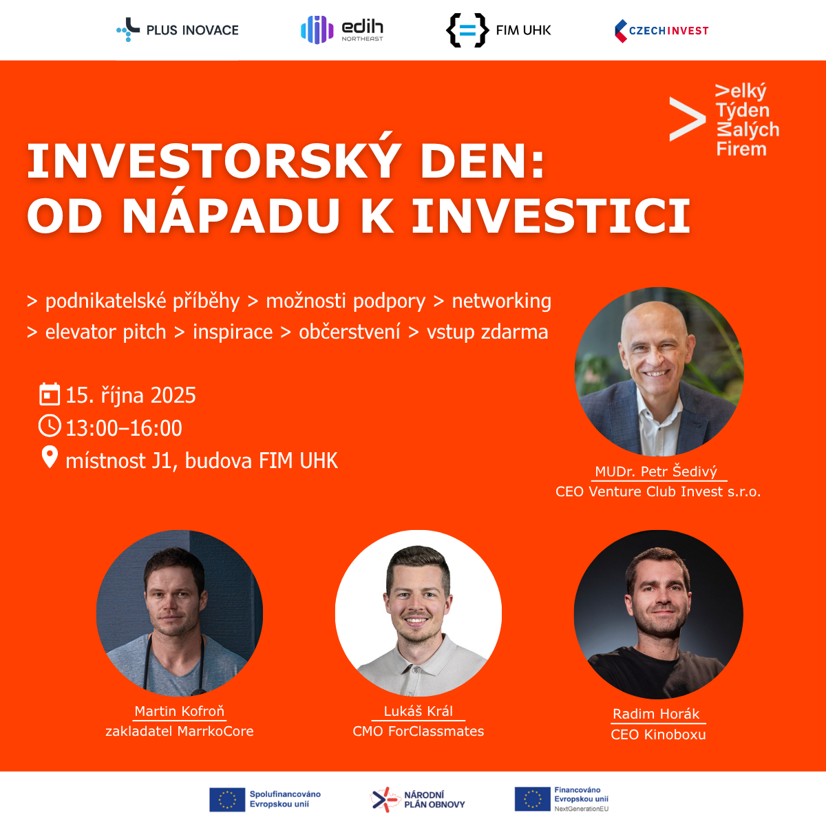 Zástupci úspěšných start-upů Martin Kofroň (Marrko Core), Lukáš Král (ForClassmates) a Radim Horák (Dramox, Kinobox.cz) se s vámi podělí o to, jaké výzvy museli překonat na své cestě k úspěchu. Dozvíte se, co fungovalo, co ne, a jak se poučili z vlastních chyb. Navíc se seznámíte s možnostmi podpory, které začínajícím podnikatelům v Královéhradeckém kraji nabízejí +inovace, Univerzita Hradec Králové a agentura CzechInvest. V případě zájmu si také můžete vyzkoušet prezentaci vlastního podnikatelského záměru formou elevator pitche před zástupcem investičního fondu.