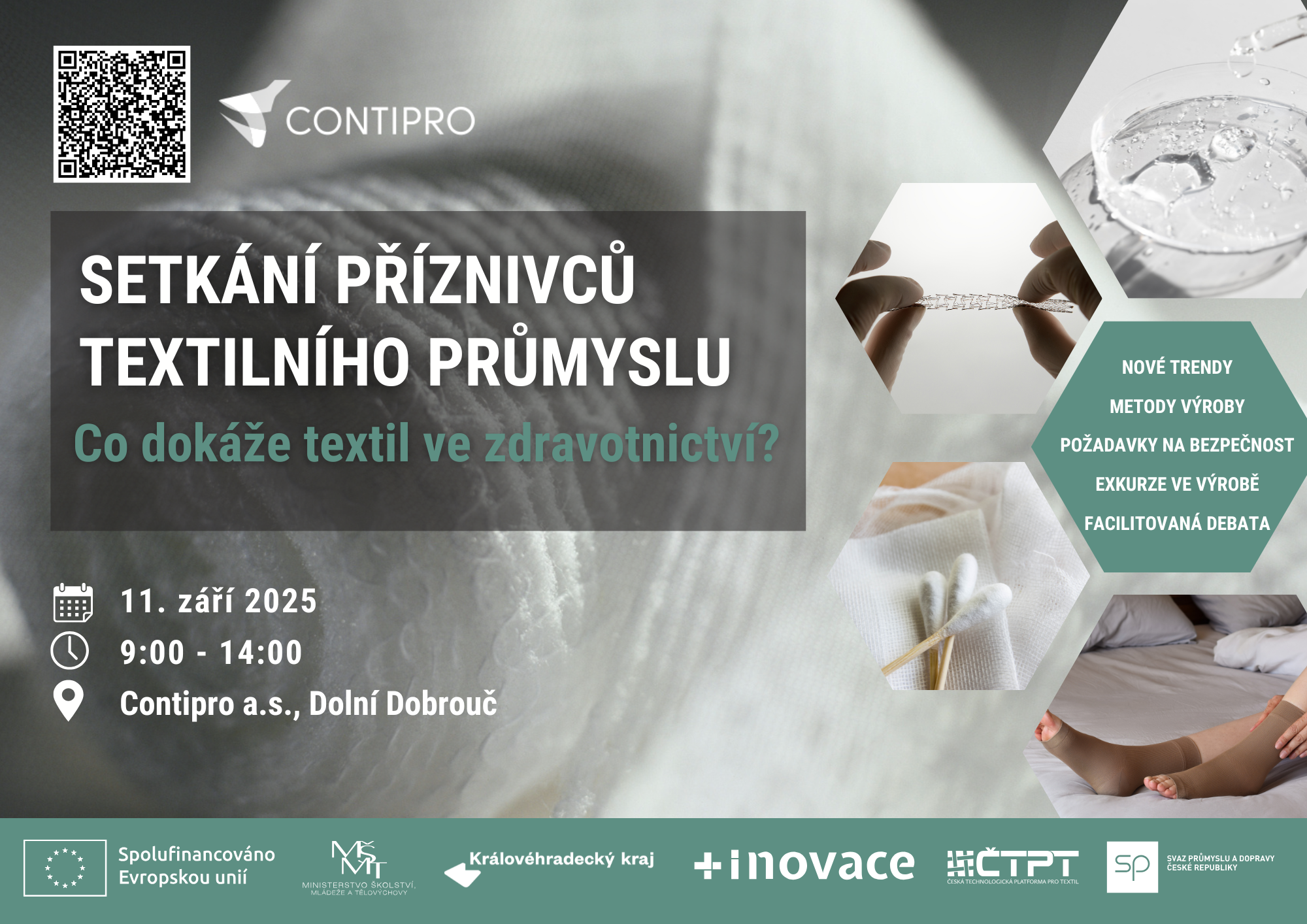 Ve spolupráci s firmou Contipro a.s. připravujeme další ze série Setkání příznivců textilního průmyslu, tentokrát s podtitulem Co dokáže textil ve zdravotnictví?