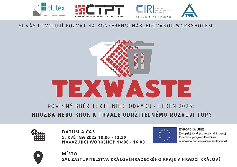 Česká technologická platforma pro textil společně s CIRI, CLUTEX a ATOK pořádá konferenci a workshop, jejímž hlavním cílem bude problematika separovaného sběru textilních odpadů po 1.1.2025, dopad konference by měl být ale daleko širší. Setkání se uskuteční zároveň jako jednání Krajské inovační platformy pro textil.
